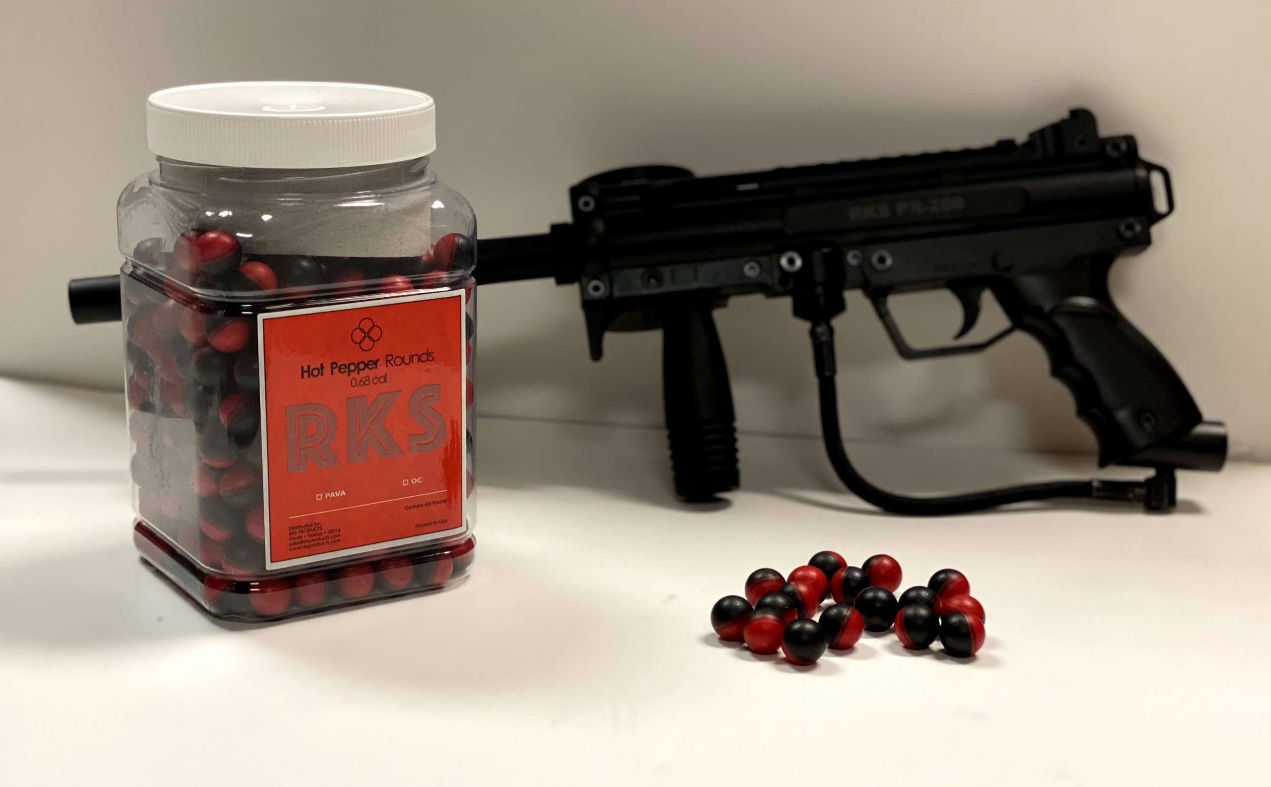 The RKS PR-200 launcher has been designed basically for use with .68″ caliber pepper balls and is compatible with balls with other chemical agents, paint balls, water balls, solid glass breaker balls, rubber balls and other .68″ caliber balls. The minimum distance for precision shooting is 20 meters for targets and 50 meters for area saturation. Supplied with black hopper for 200 spheres. Include relief valve. Picatinny Rail MIL-STD 1913 on top for accessories.